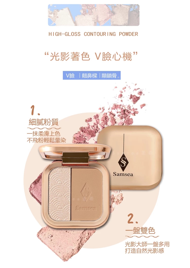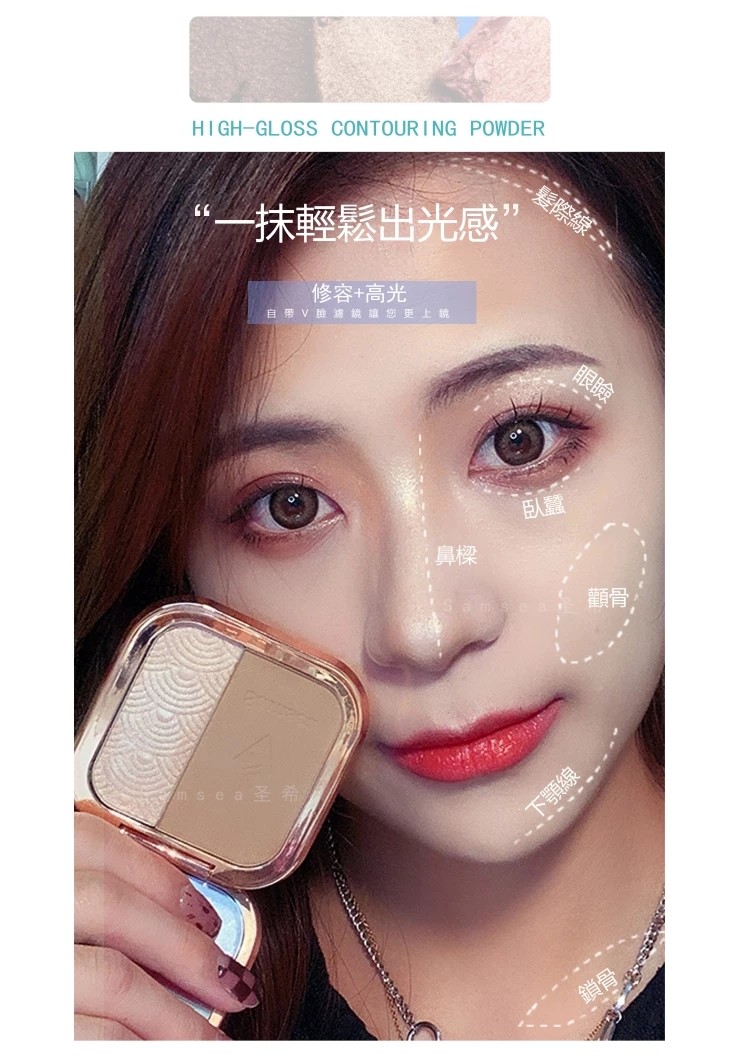 彩妝Samsea聖希雙色立體高光修容一體盤修容盤推薦,立體高光陰影修容粉防水防汗提亮膚色修容打亮修容陰影盤、鼻影盤、眼影盤選色非常適合亞洲膚色。